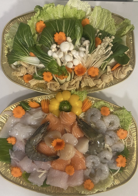 📍Veuillez commander avant 48hBouillon maison sate légèrement épicée 🌶️avec nouilles chinois, les légumes asiatique 🥬( chou de chine, park choi , tofu , champignons 🍄🟫 ... Accompagné d’un plateau poisson, crevettes, viande de bœuf et poulet ou que la viande .